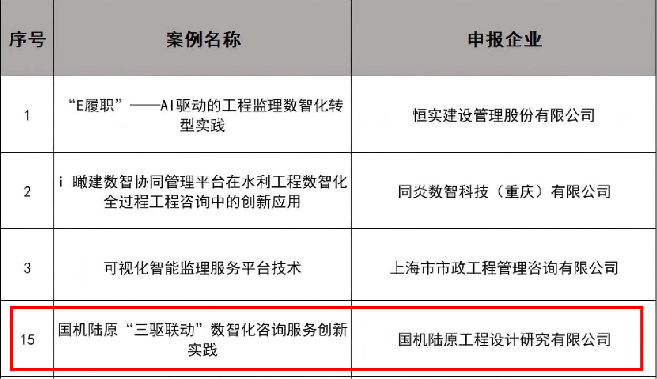 10月17日,公司申报的《国机陆原“三驱联动”数智化咨询服务创新实践》案例,在《建设监理》杂志第二届“工程监理咨询企业创新实践卓越案例”征集中,从全国众多优秀实践中脱颖而出,成为30份入选的优秀案例之一,标志着公司在工程咨询数智化转型领域的先行探索与领先实力获得了行业高度认可。
