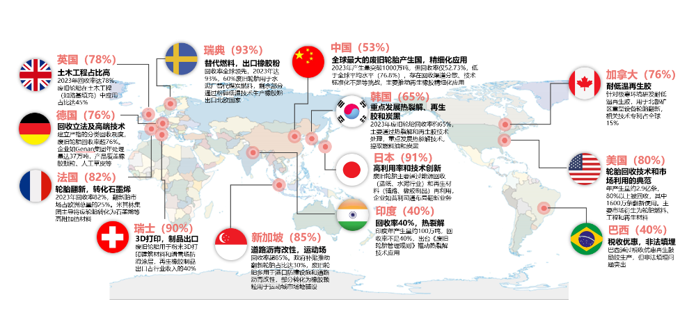 全球废旧轮胎回收产业格局呈现显著的地域差异与技术分层,发达国家凭借完善的政策支持、成熟的技术体系占据主导地位,通过立法强制回收及经济鼓励措施从而使废旧轮胎回收率超过70%。而发展中国家受限于管理机制滞后、技术落后及产业链分散,仍面临资源浪费与环境污染双重压力,主要侧重技术引进和产业链整合,多数发展中国家回收率仍低于50%。中国是全球最大的废旧轮胎产生国,目前主要以再生橡胶精细化应用为主,存在回收渠道分散、技术标准化不足等挑战。